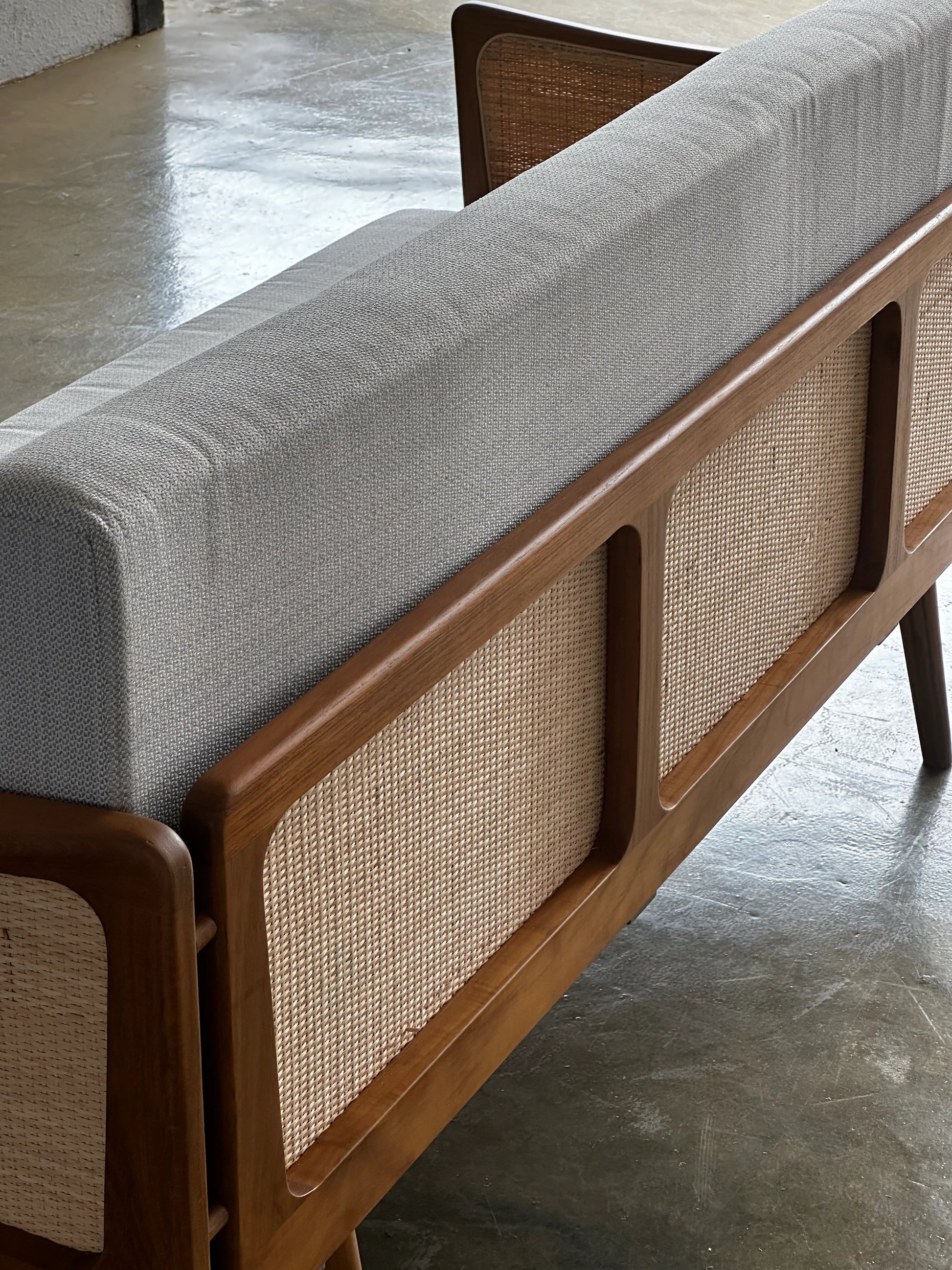 Yet, true to Woodsculp’s artisanal vision, the Fortress is anything but heavy. We’ve contrasted the solid teak architecture with meticulously woven, breathable cane panels that wrap seamlessly around the back and sides. Paired with plush, tailored upholstery in a soothing, neutral weave, the Fortress isn't just a piece of furniture, it’s a tranquil retreat built to last a lifetime.