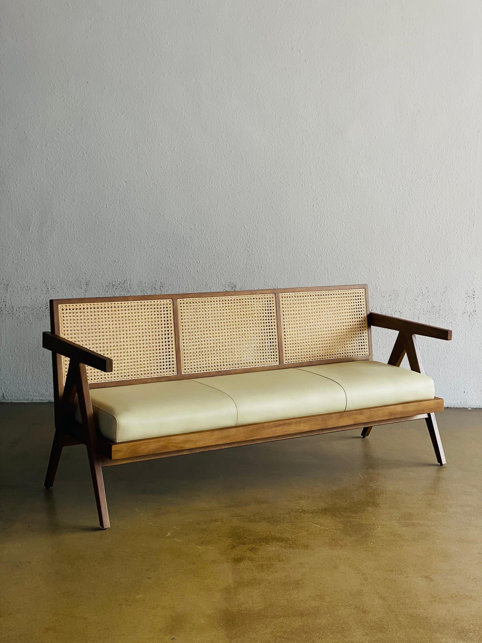 Breathe life into your living space with the Zephyr Sofa, a striking homage to the iconic Chandigarh design movement. Meticulously handcrafted by the artisans at woodsculp, this statement piece features distinctive, architectural V-shaped legs that provide both robust support and an unmistakable mid-century silhouette. The frame is constructed from responsibly sourced, premium solid teak wood, celebrated for its rich, warm grain and lifelong durability. Contrasting the solid wood structure is a breathable, three-panel woven cane backrest that allows light to filter through, giving the sofa an airy, weightless quality. Finished with a plush, cream-colored upholstered seat with subtle blind tufting, the Zephyr effortlessly bridges the gap between historical design and contemporary comfort.