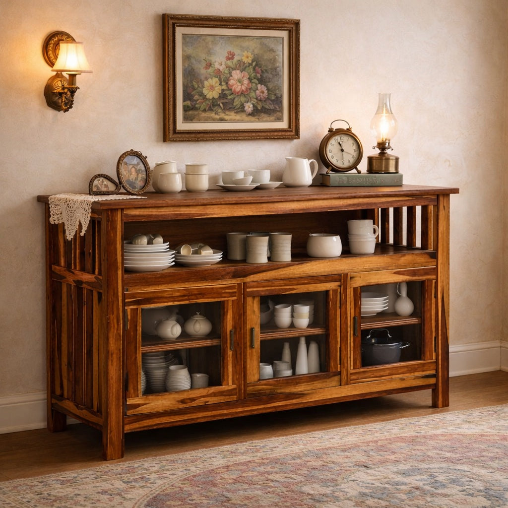 Showcase your cherished dining essentials with the rustic elegance of the Woodsculp Heritage Collection Crockery Unit. Expertly handcrafted from premium, solid Sheesham wood (Indian Rosewood), this cabinet defines durable luxury with its rich, warm grain and natural finish.