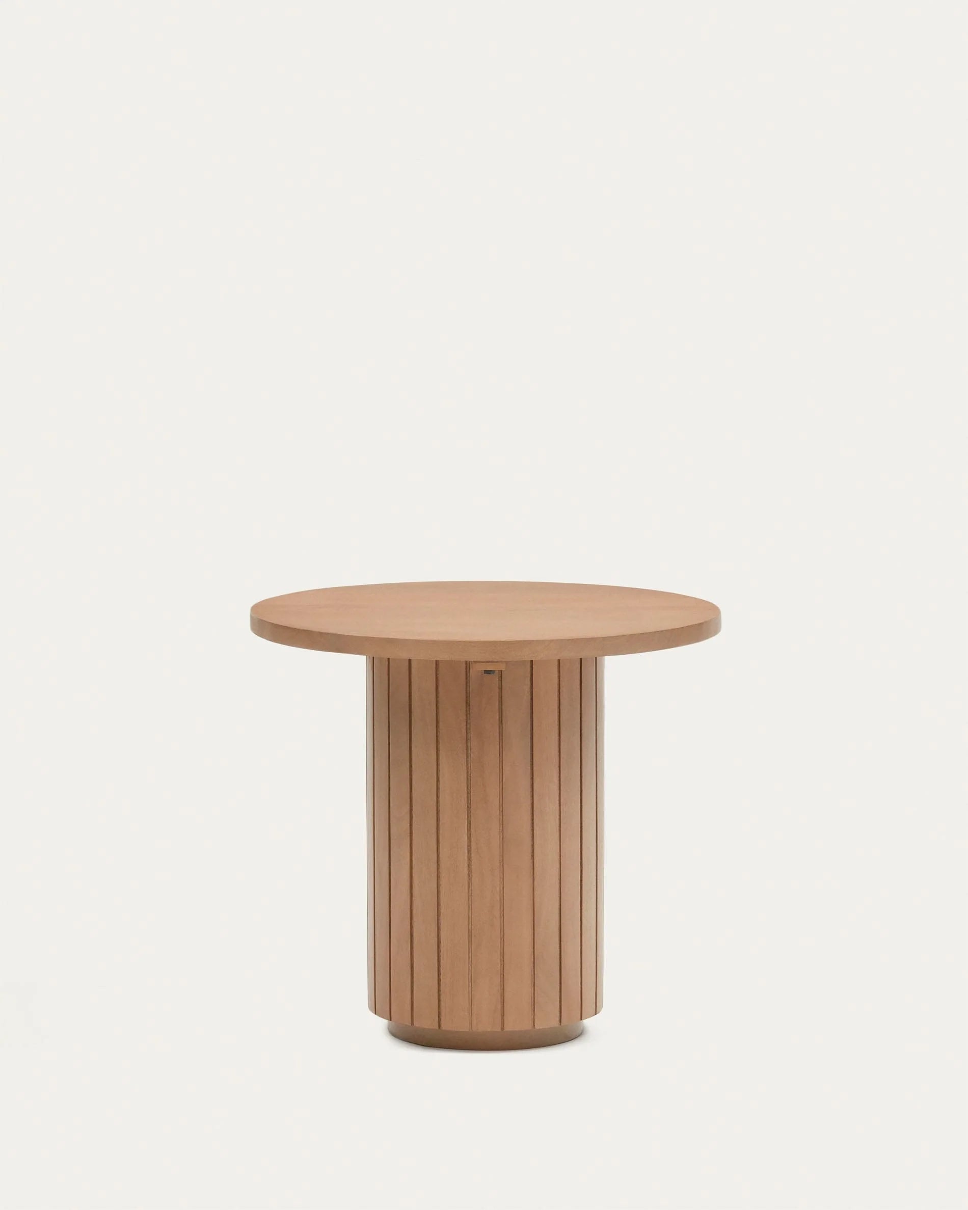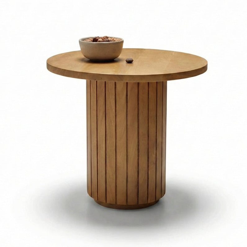 Introduce a breath of fresh design to your living space with the Mist Side Table by Woodsculp. Crafted entirely from premium solid wood, this piece defines modern sophistication with its striking architectural silhouette. The table features a smooth, circular top resting effortlessly on a sturdy, cylindrical base wrapped in vertical fluting. These rhythmic wooden slats create a play of light and shadow, adding texture and depth to any corner. Whether styled beside a sofa or standing alone as an accent piece, the Mist table brings a calm, grounded presence to your home.