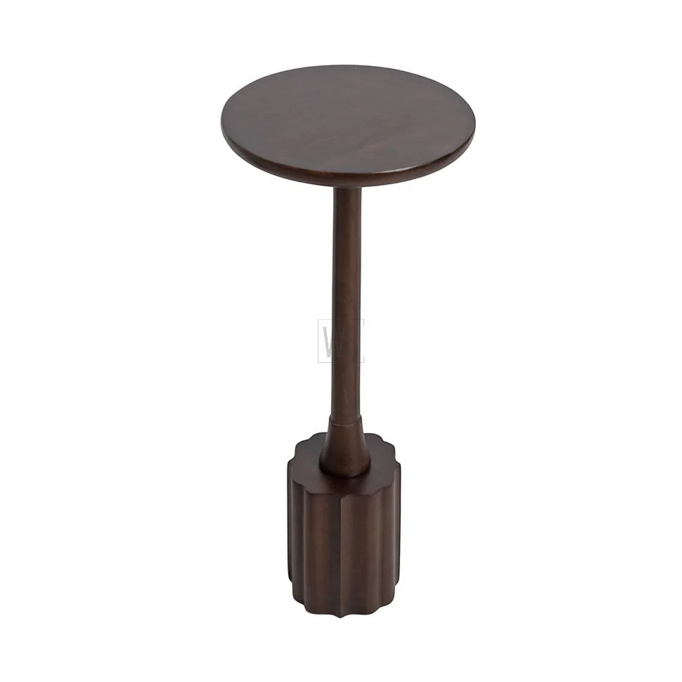 Introducing Quill by Woodsculp. Carved entirely from solid wood, this accent table combines a smooth, round top with a striking architectural base. Its graceful, turned stem proves that functional, everyday craftsmanship can double as a work of art.