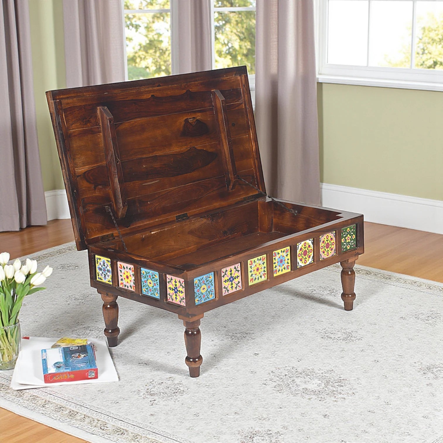 Meet the Rang Mahal Coffee Table by Woodsculp- a functional work of art. Handcrafted from solid Sheesham wood, its defining feature is a vibrant, hand-painted ceramic tile inlay, inspired by its name, "Palace of Colors." The smart lift-top design opens to reveal ample hidden storage, seamlessly blending bohemian style with everyday practicality. It's not just a table; it's the centerpiece of your room's story.