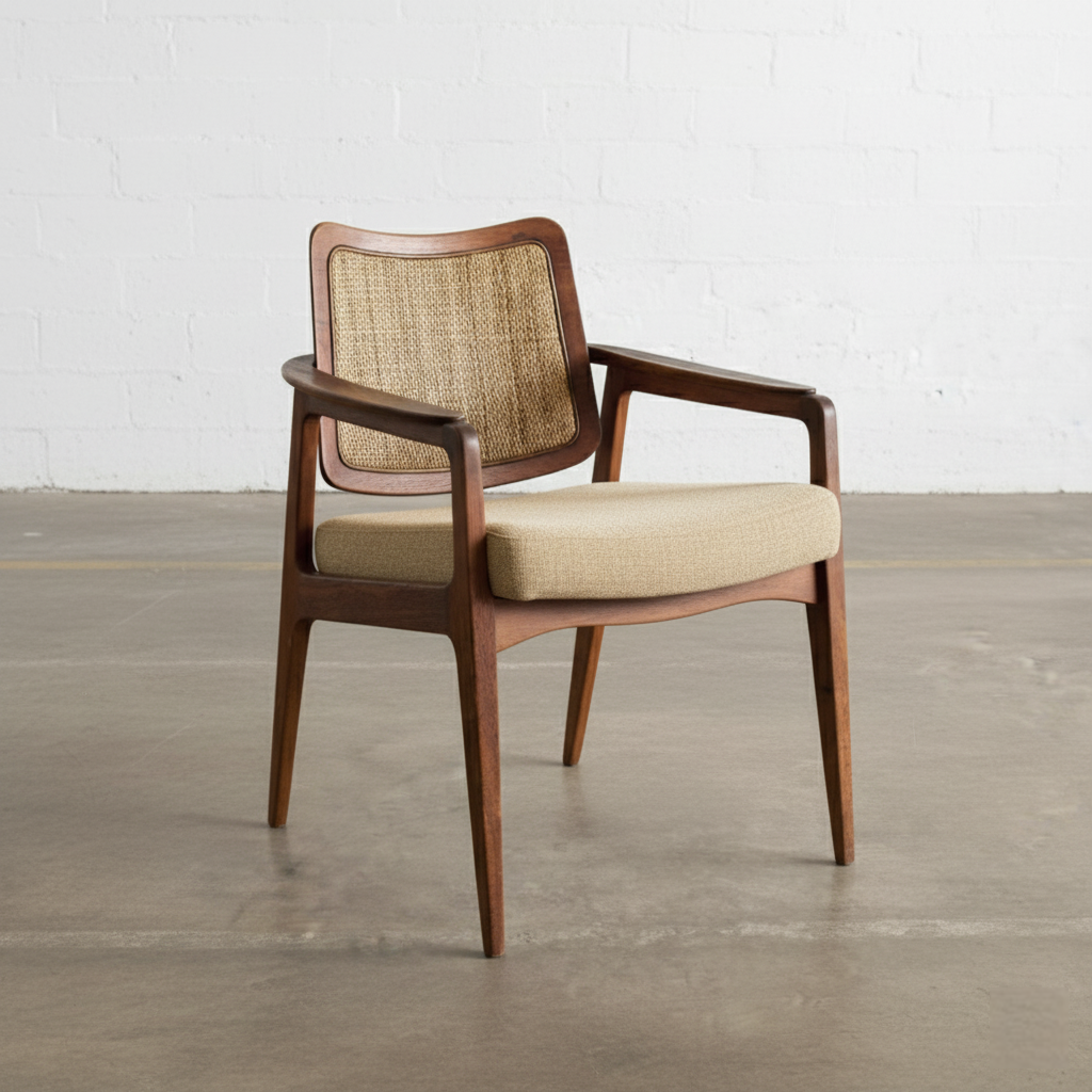 Experience timeless elegance with the Kai Teak & Cane Armchair by Woodsculp. Masterfully crafted from solid teak wood and featuring a hand-woven cane backrest, this versatile chair combines mid-century modern aesthetics with unparalleled comfort. Perfect as a dining chair, accent piece, or a stylish office seat.